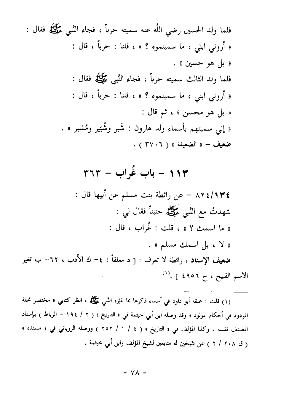 132/824- (ضعيف) عن رَائِطَةُ بِنْتُ مُسْلِمٍ، عَنْ أَبِيهَا، قَالَ: شَهِدْتُ مَعَ النَّبِيِّ صَلَّى اللهُ عَلَيْهِ وَسَلَّمَ حُنيناً. فَقَالَ لِي: "مَا اسْمُكَ؟ "، قُلْتُ: غُرَابٌ! قَالَ: "لَا، بَلِ اسْمُكَ: مُسْلِمٌ".