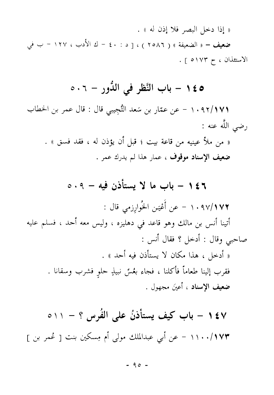 169/1092- (ضعيف) عَنْ عَمَّارِ بْنِ سَعْدٍ التُّجِيبِيِّ قَالَ: قَالَ عُمَرُ بْنُ الْخَطَّابِ رَضِيَ اللَّهُ عَنْهُ: "مَنْ مَلَأَ عَيْنَيْهِ مِنْ قَاعَةِ بيتٍ؛ قَبْلَ أَنْ يُؤْذَنَ لَهُ، فَقَدْ فَسَقَ".