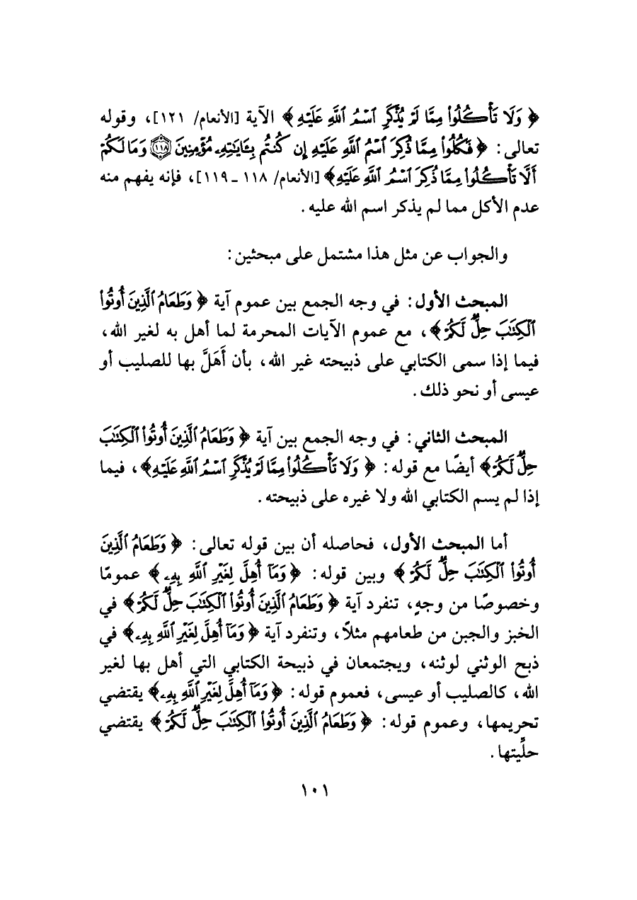 أما المبحث الأول، فحاصله أن بين قوله تعالى: {وَطَعَامُ الَّذِينَ أُوتُوا الْكِتَابَ حِلٌّ لَكُمْ} وبين قوله: {وَمَا أُهِلَّ لِغَيْرِ اللَّهِ بِهِ} عمومًا وخصوصًا من وجهِ، تنفرد آية {وَطَعَامُ الَّذِينَ أُوتُوا الْكِتَابَ حِلٌّ لَكُمْ} في الخبز والجبن من طعامهم مثلًا، وتنفرد آية {وَمَا أُهِلَّ لِغَيْرِ اللَّهِ بِهِ} في ذبح الوثني لوثنه، ويجتمعان في ذبيحة الكتابي التي أهل بها لغير اللَّه، كالصليب أو عيسى، فعموم قوله: {وَمَا أُهِلَّ لِغَيْرِ اللَّهِ بِهِ} يقتضي تحريمها، وعموم قوله: {وَطَعَامُ الَّذِينَ أُوتُوا الْكِتَابَ حِلٌّ لَكُمْ} يقتضي حلِّيتها.