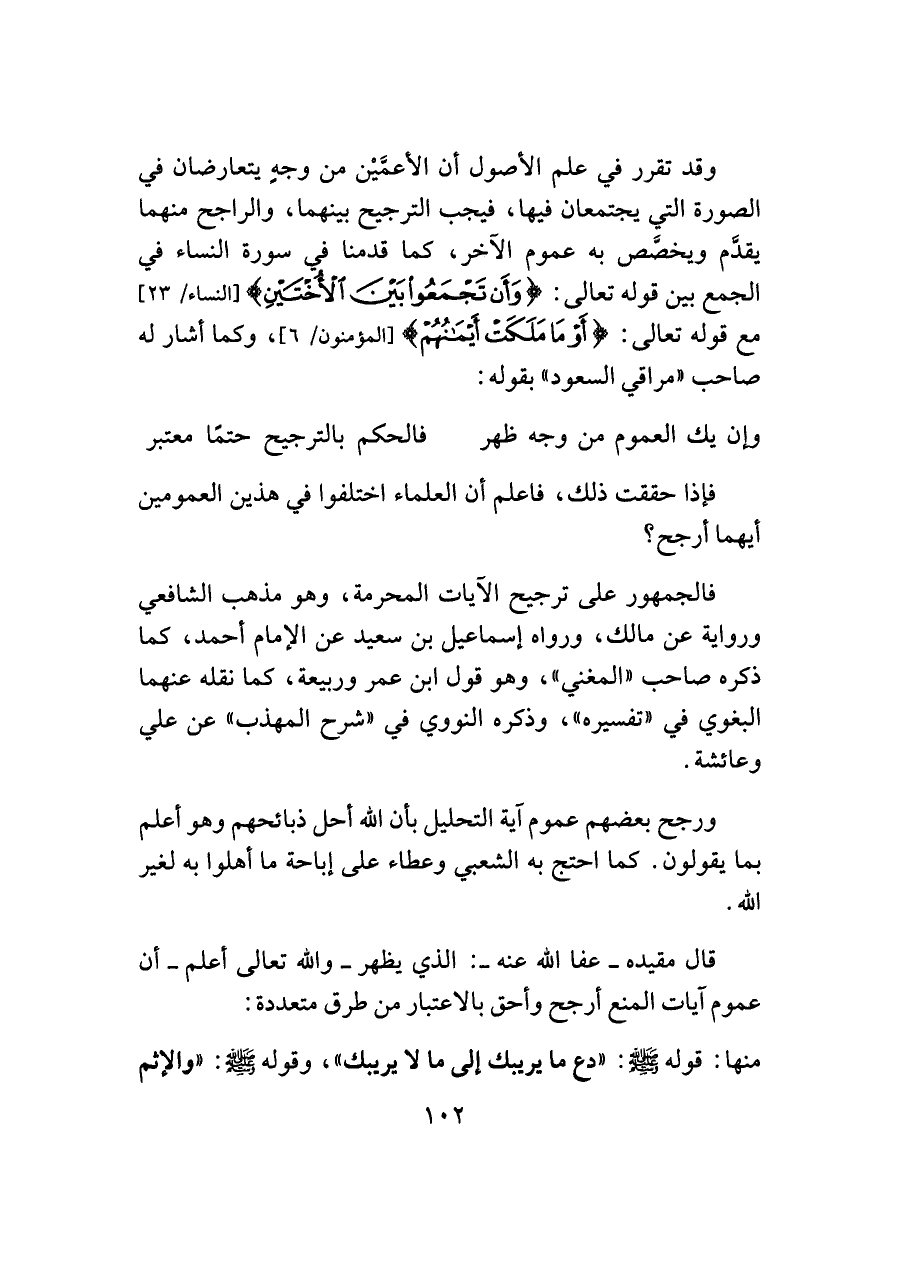 وقد تقرر في علم الأصول أن الأعمَّيْن من وجهٍ يتعارضان في الصورة التي يجتمعان فيها، فيجب الترجيح بينهما، والراجح منهما يقدَّم ويخصَّص به عموم الآخر، كما قدمنا في سورة النساء في الجمع بين قوله تعالى: {وَأَنْ تَجْمَعُوا بَيْنَ الْأُخْتَيْنِ} [النساء/ ٢٣] مع قوله تعالى: {أَوْ مَا مَلَكَتْ أَيْمَانُهُمْ} [المؤمنون/ ٦]، وكما أشار له صاحب "مراقي السعود" بقوله: