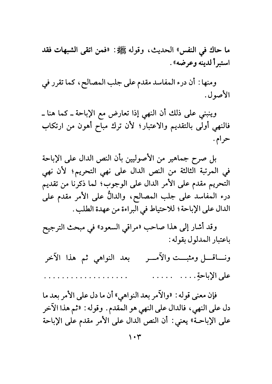 بل صرح جماهير من الأصوليين بأن النص الدال على الإباحة في المرتبة الثالثة من النص الدال على نهي التحريم؛ لأن نهي التحريم مقدم على الأمر الدال على الوجوب؛ لما ذكرنا من تقديم درء المفاسد على جلب المصالح، والدالُّ على الأمر مقدم على الدال على الإباحة؛ للاحتياط في البراءة من عهدة الطلب.