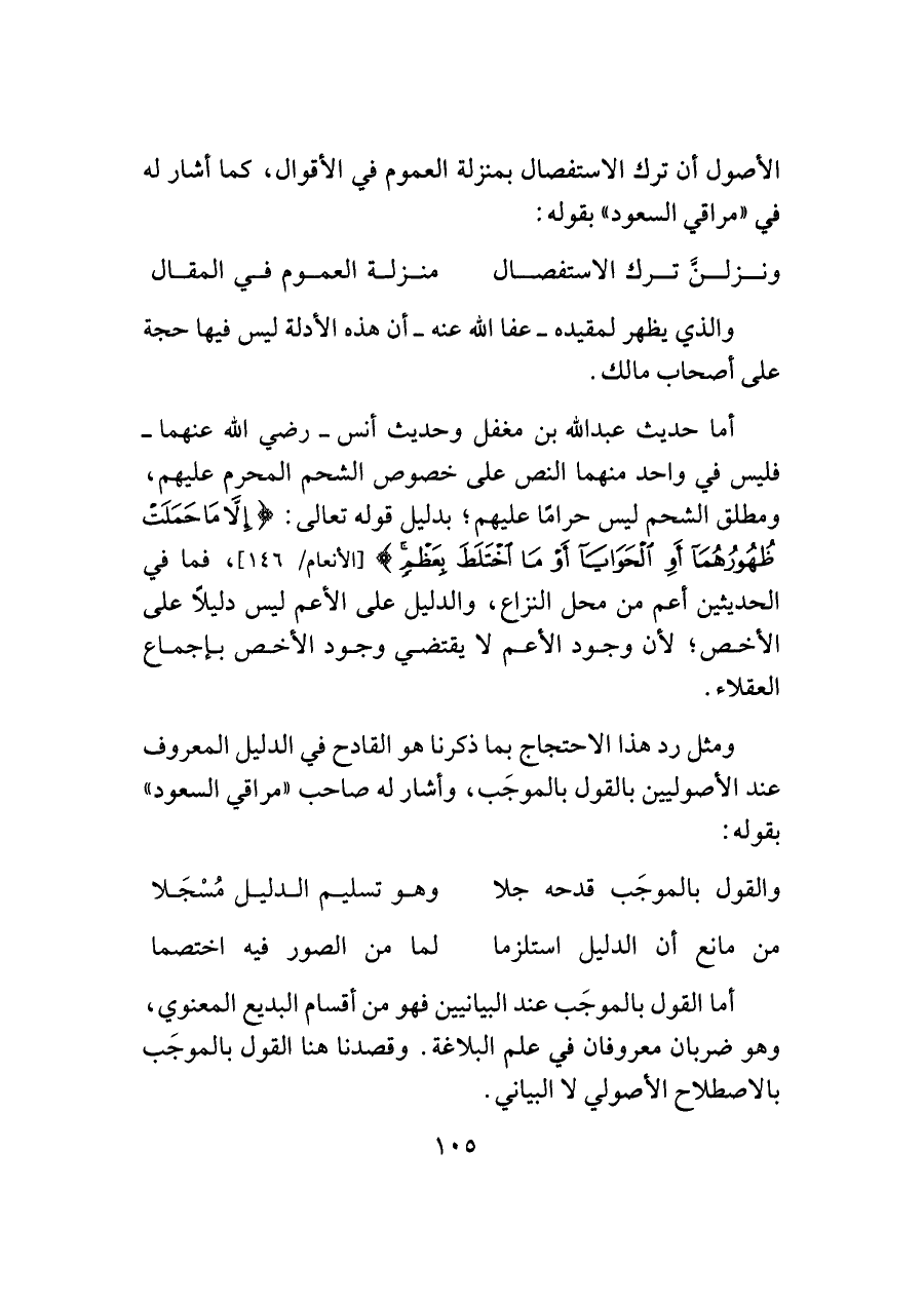 ومثل رد هذا الاحتجاج بما ذكرنا هو القادح في الدليل المعروف عند الأصوليين بالقول بالموجَب، وأشار له صاحب "مراقي السعود" بقوله: