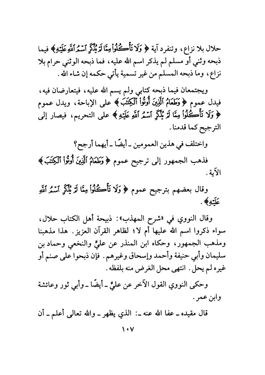 ويجتمعان فيما ذبحه كتابي ولم يسم اللَّه عليه، فيتعارضان فيه، فيدل عموم {وَطَعَامُ الَّذِينَ أُوتُوا الْكِتَابَ} على الإباحة، ويدل عموم {وَلَا تَأْكُلُوا مِمَّا لَمْ يُذْكَرِ اسْمُ اللَّهِ عَلَيْهِ} على التحريم، فيصار إلى الترجيح كما قدمنا.