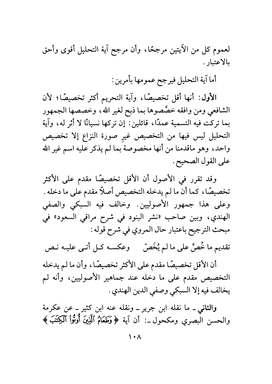 الأول: أنها أقل تخصيصًا، وآية التحريم أكثر تخصيصًا؛ لأن الشافعي ومن وافقه خصَّصوها بما ذبح لغير اللَّه، وخصصها الجمهور بما تركت فيه التسمية عمدًا، قائلين: إن تركها نسيانًا لا أثر له، وآية التحليل ليس فيها من التخصيص غيرِ صورة النزاع إلا تخصيص واحد، وهو ما قدمنا من أنها مخصوصة بما لم يذكر عليه اسم غير اللَّه على القول الصحيح.