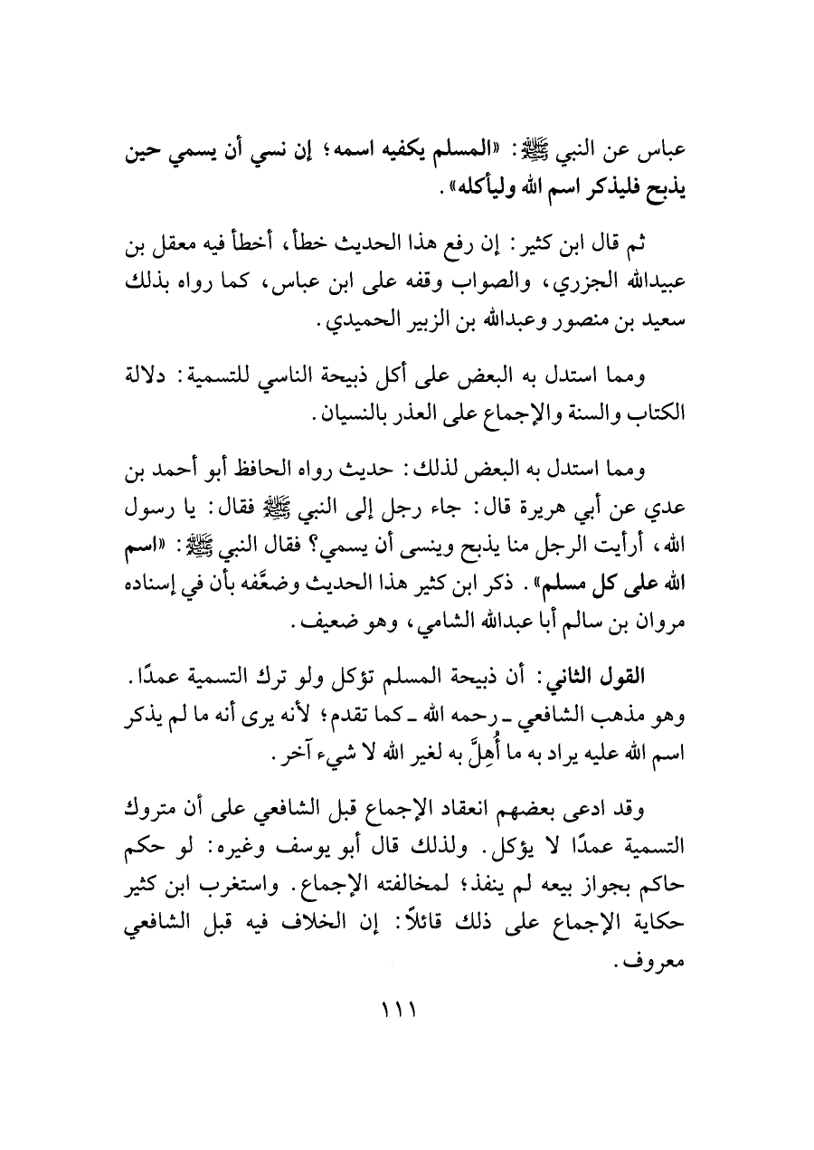 عباس عن النبي -صلى اللَّه عليه وسلم-: "المسلم يكفيه اسمه؛ إن نسي أن يسمي حين يذبح فليذكر اسم اللَّه وليأكله".