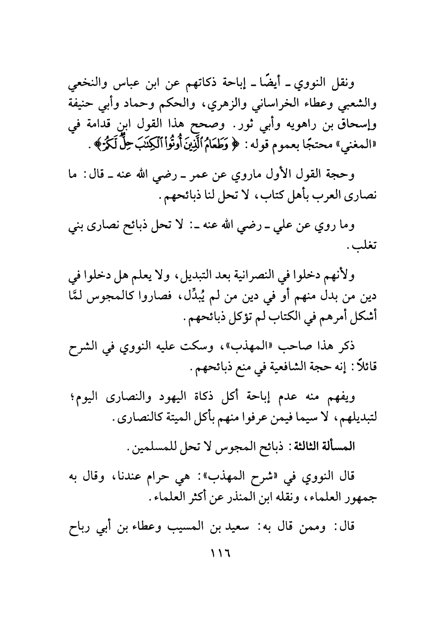 ونقل النووي -أيضًا- إباحة ذكاتهم عن ابن عباس والنخعي والشعبي وعطاء الخراساني والزهري، والحكم وحماد وأبى حنيفة وإسحاق بن راهويه وأبي ثور. وصحح هذا القول ابن قدامة في "المغني" محتجًا بعموم قوله: {وَطَعَامُ الَّذِينَ أُوتُوا الْكِتَابَ حِلٌّ لَكُمْ}.
