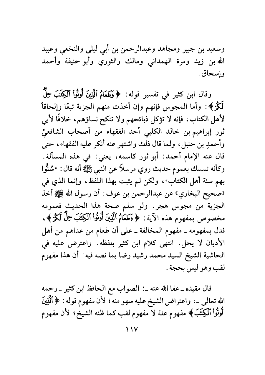 وقال ابن كثير في تفسير قوله: {وَطَعَامُ الَّذِينَ أُوتُوا الْكِتَابَ حِلٌّ لَكُمْ}: وأما المجوس فإنهم وإن أخذت منهم الجزية تبعًا وإلحاقًا لأهل الكتاب، فإنه لا تؤكل ذبائحهم ولا تنكح نساؤهم، خلافًا لأبي ثور إبراهيم بن خالد الكلبي أحد الفقهاء من أصحاب الشافعيِّ وأحمدِ بن حنبل، ولما قال ذلك واشتهر عنه أنكر عليه الفقهاء، حتى قال عنه الإمام أحمد: أبو ثور كاسمه، يعني: في هذه المسألة. وكأنه تمسك بعموم حديث روي مرسلًا عن النبي -صلى اللَّه عليه وسلم- أنه قال: "سُنُّوا بهم سنة أهل الكتاب"، ولكن لم يثبت بهذا اللفظ، وإنما الذي في "صحيح البخاري" عن عبد الرحمن بن عوف: أن رسول اللَّه -صلى اللَّه عليه وسلم- أخذ الجزية من مجوس هجر. ولو سلم صحة هذا الحديث فعمومه مخصوص بمفهوم هذه الآية: {وَطَعَامُ الَّذِينَ أُوتُوا الْكِتَابَ حِلٌّ لَكُمْ}، فدل بمفهومه -مفهوم المخالفة- على أن طعام من عداهم من أهل الأديان لا يحل. انتهى كلام ابن كثير بلفظه. واعترض عليه في الحاشية الشيخ السيد محمد رشيد رضا بما نصه فيه: أن هذا مفهوم لقب وهو ليس بحجة.