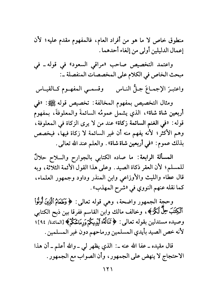 ومثال التخصيص بمفهوم المخالفة: تخصيص قوله -صلى اللَّه عليه وسلم-: "في أربعين شاة شاة"، الذي يشمل عمومُه السائمةَ والمعلوفةَ، بمفهوم قوله: "في الغنم السائمة زكاة" عند من لا يرى الزكاة في المعلوفة، وهم الأكثر؛ لأنه يفهم منه أن غير السائمة لا زكاة فيها، فيخصص بذلك عموم: "في أربعين شاة شاة". والعلم عند اللَّه تعالى.