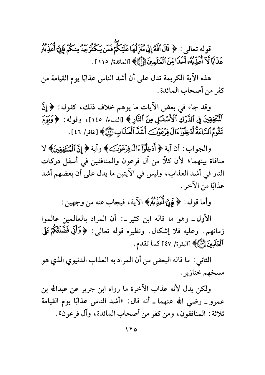 ولكن يدل لأنه عذاب الآخرة ما رواه ابن جرير عن عبد اللَّه بن عمرو -رضي اللَّه عنهما- أنه قال: "أشد الناس عذابًا يوم القيامة ثلاثة: المنافقون، ومن كفر من أصحاب المائدة، وآل فرعون".