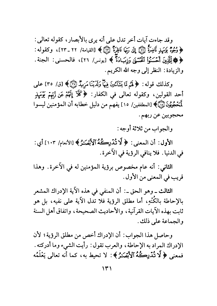 وقد جاءت آيات أخر تدل على أنه يرى بالأبصار، كقوله تعالى: {وُجُوهٌ يَوْمَئِذٍ نَاضِرَةٌ (٢٢) إِلَى رَبِّهَا نَاظِرَةٌ (٢٣)} [القيامة/ ٢٢ - ٢٣]، وكقوله: {لِلَّذِينَ أَحْسَنُوا الْحُسْنَى وَزِيَادَةٌ} [يونس/ ٢٦]، فالحسنى: الجنة. والزيادة: النظر إلى وجه اللَّه الكريم.