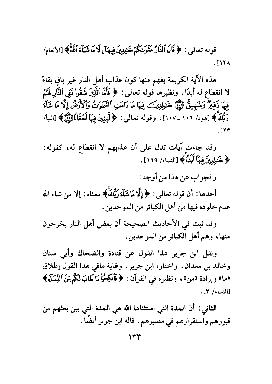 هذه الآية الكريمة يفهم منها كون عذاب أهل النار غير باقٍ بقاء لا انقطاع له أبدًا. ونظيرها قوله تعالى: {فَأَمَّا الَّذِينَ شَقُوا فَفِي النَّارِ لَهُمْ فِيهَا زَفِيرٌ وَشَهِيقٌ (١٠٦) خَالِدِينَ فِيهَا مَا دَامَتِ السَّمَاوَاتُ وَالْأَرْضُ إِلَّا مَا شَاءَ رَبُّكَ} [هود/ ١٠٦ - ١٠٧]، وقوله تعالى: {لَابِثِينَ فِيهَا أَحْقَابًا (٢٣)} [النبأ/ ٢٣].