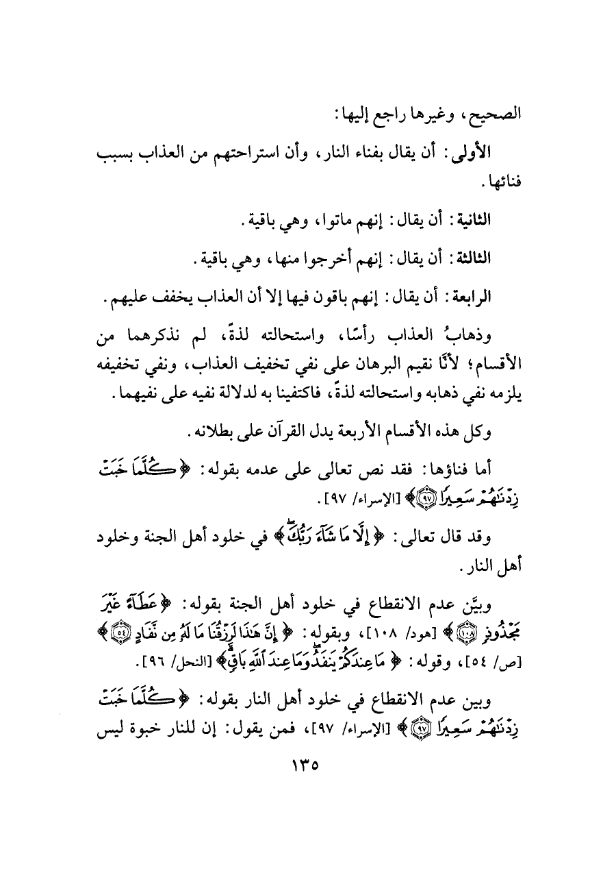 أما فناؤها: فقد نص تعالى على عدمه بقوله: {كُلَّمَا خَبَتْ زِدْنَاهُمْ سَعِيرًا} [الإسراء/ ٩٧].