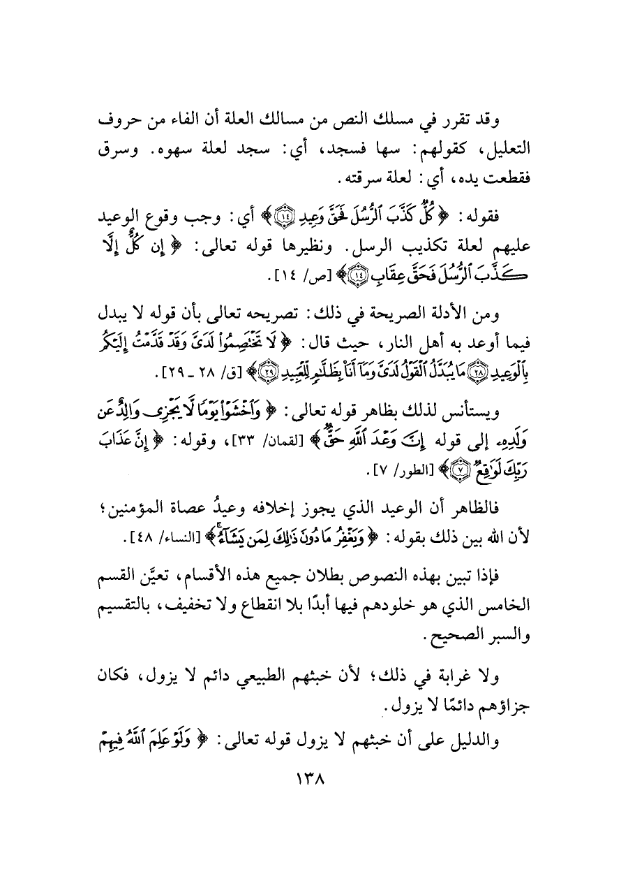 فإذا تبين بهذه النصوص بطلان جميع هذه الأقسام، تعيَّن القسم الخامس الذي هو خلودهم فيها أبدًا بلا انقطاع ولا تخفيف، بالتقسيم والسبر الصحيح.