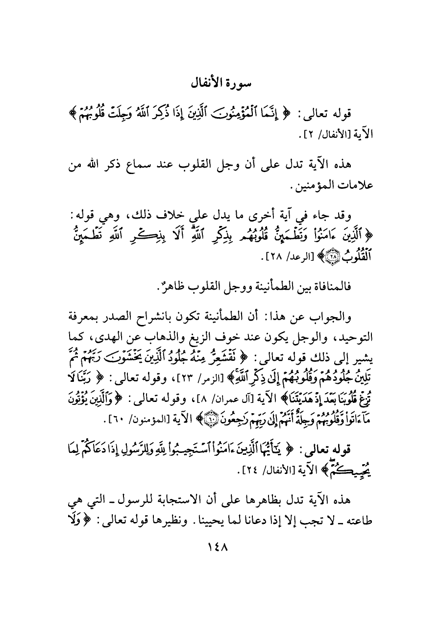 والجواب عن هذا: أن الطمأنينة تكون بانشراح الصدر بمعرفة التوحيد، والوجل يكون عند خوف الزيغ والذهاب عن الهدى، كما يشير إلى ذلك قوله تعالى: {تَقْشَعِرُّ مِنْهُ جُلُودُ الَّذِينَ يَخْشَوْنَ رَبَّهُمْ ثُمَّ تَلِينُ جُلُودُهُمْ وَقُلُوبُهُمْ إِلَى ذِكْرِ اللَّهِ} [الزمر/ ٢٣]، وقوله تعالى: {رَبَّنَا لَا تُزِغْ قُلُوبَنَا بَعْدَ إِذْ هَدَيْتَنَا} الآية [آل عمران/ ٨]، وقوله تعالى: {وَالَّذِينَ يُؤْتُونَ مَا آتَوْا وَقُلُوبُهُمْ وَجِلَةٌ أَنَّهُمْ إِلَى رَبِّهِمْ رَاجِعُونَ (٦٠)} الآية [المؤمنون/ ٦٠].