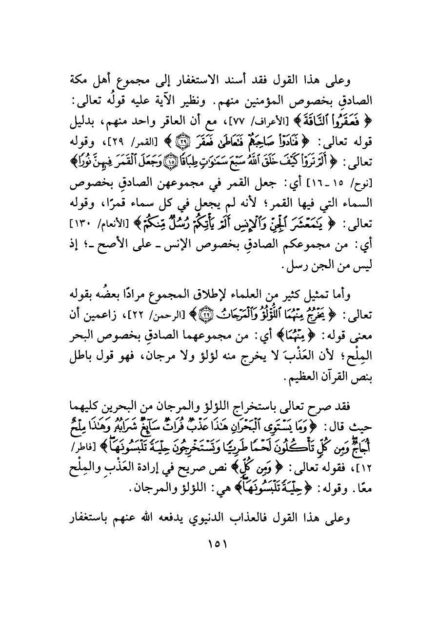 وعلى هذا القول فقد أسند الاستغفار إلى مجموع أهل مكة الصادقِ بخصوص المؤمنين منهم. ونظير الآية عليه قولُه تعالى: {فَعَقَرُوا النَّاقَةَ} [الأعراف/ ٧٧]، مع أن العاقر واحد منهم، بدليل قوله تعالى: {فَنَادَوْا صَاحِبَهُمْ فَتَعَاطَى فَعَقَرَ (٢٩)} [القمر/ ٢٩] وقوله تعالى: {أَلَمْ تَرَوْا كَيْفَ خَلَقَ اللَّهُ سَبْعَ سَمَاوَاتٍ طِبَاقًا (١٥) وَجَعَلَ الْقَمَرَ فِيهِنَّ نُورًا} [نوح/ ١٥ - ١٦] أي: جعل القمر في مجموعهن الصادقِ بخصوص السماء التي فيها القمر؛ لأنه لم يجعل في كل سماء قمرًا، وقوله تعالى: {يَامَعْشَرَ الْجِنِّ وَالْإِنْسِ أَلَمْ يَأْتِكُمْ رُسُلٌ مِنْكُمْ} [الأنعام/ ١٣٠] أي: من مجموعكم الصادقِ بخصوص الإنس -على الأصح-؛ إذ ليس من الجن رسل.
