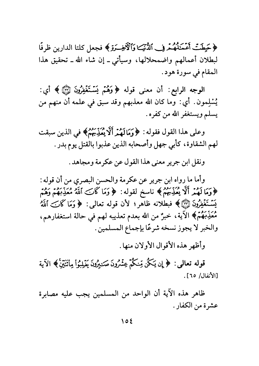 الوجه الرابع: أن معنى قوله {وَهُمْ يَسْتَغْفِرُونَ (٣٣)} أي: يُسْلِمون. أي: وما كان اللَّه معذبهم وقد سبق في علمه أن منهم من يسلم ويستغفر اللَّه من كفره.