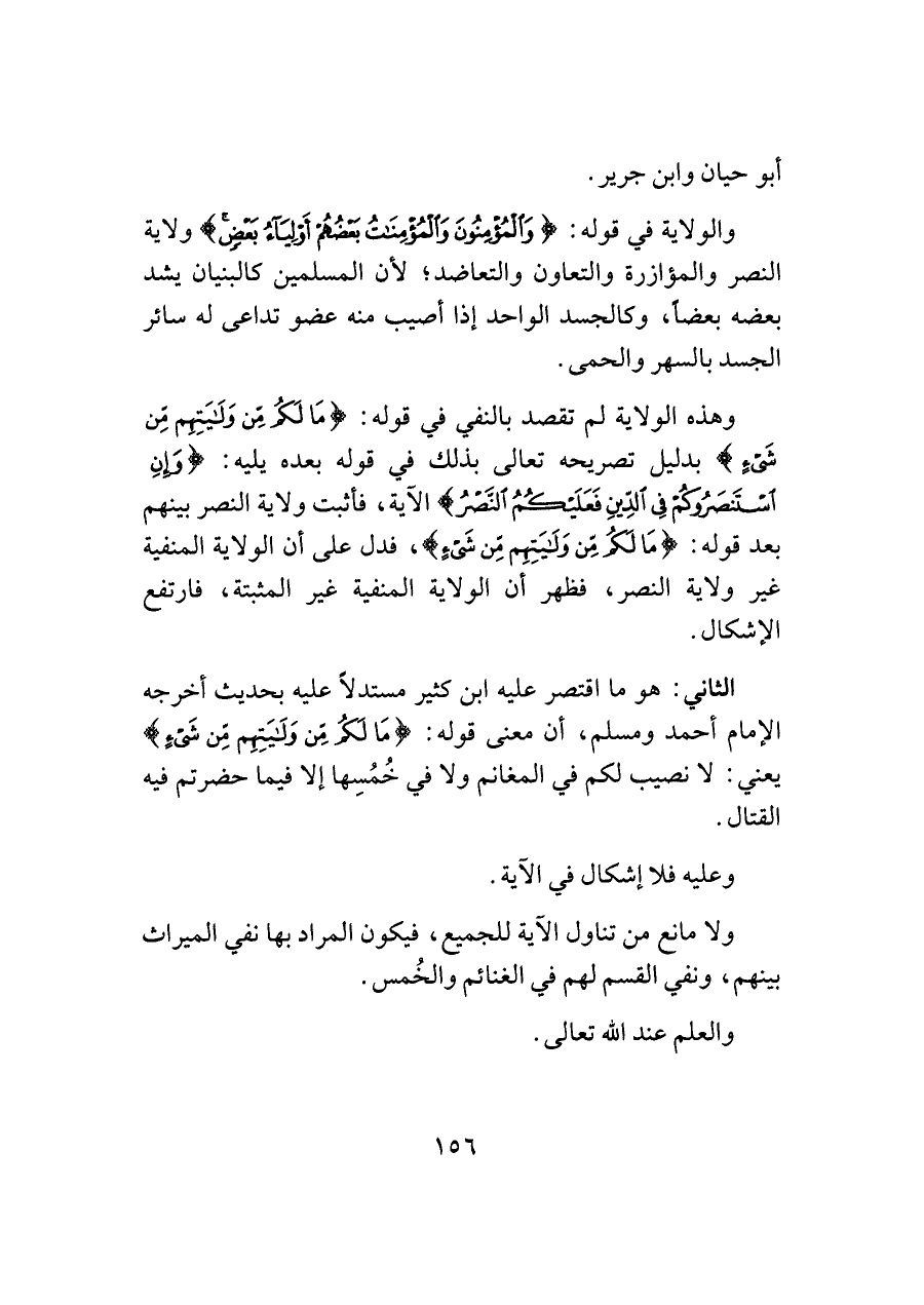 وهذه الولاية لم تقصد بالنفي قوله: {مَا لَكُمْ مِنْ وَلَايَتِهِمْ مِنْ شَيْءٍ} بدليل تصريحه تعالى بذلك في قوله بعده يليه: {وَإِنِ اسْتَنْصَرُوكُمْ فِي الدِّينِ فَعَلَيْكُمُ النَّصْر} الآية، فأثبت ولاية النصر بينهم بعد قوله: {مَا لَكُمْ مِنْ وَلَايَتِهِمْ مِنْ شَيْءٍ}، فدل على أن الولاية المنفية غير ولاية النصر، فظهر أن الولاية المنفية غير المثبتة، فارتفع الإشكال.