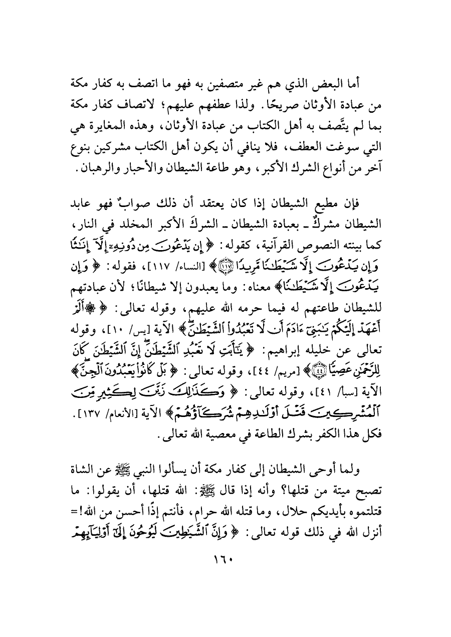 فإن مطيع الشيطان إذا كان يعتقد أن ذلك صواب فهو عابد الشيطان مشركٌ -بعبادة الشيطان- الشركَ الأكبر المخلد في النار، كما بينته النصوص القرآنية، كقوله: {إِنْ يَدْعُونَ مِنْ دُونِهِ إِلَّا إِنَاثًا وَإِنْ يَدْعُونَ إِلَّا شَيْطَانًا مَرِيدًا (١١٧)} [النساء/ ١١٧]، فقوله: {وَإِنْ يَدْعُونَ إِلَّا شَيْطَانًا} معناه: وما يعبدون إلا شيطانًا؛ لأن عبادتهم للشيطان طاعتهم له فيما حرمه اللَّه عليهم، وقوله تعالى: {أَلَمْ أَعْهَدْ إِلَيْكُمْ يَابَنِي آدَمَ أَنْ لَا تَعْبُدُوا الشَّيْطَانَ} الآية [يس/ ٦٠]، وقوله تعالى عن خليله إبراهيم: {يَاأَبَتِ لَا تَعْبُدِ الشَّيْطَانَ إِنَّ الشَّيْطَانَ كَانَ لِلرَّحْمَنِ عَصِيًّا (٤٤)} [مريم/ ٤٤]، وقوله تعالى: {بَلْ كَانُوا يَعْبُدُونَ الْجِنَّ} الآية [سبأ/ ٤١]، وقوله تعالى: {وَكَذَلِكَ زَيَّنَ لِكَثِيرٍ مِنَ الْمُشْرِكِينَ قَتْلَ أَوْلَادِهِمْ شُرَكَاؤُهُمْ} الآية [الأنعام/ ١٣٧]. فكل هذا الكفر بشرك الطاعة في معصية اللَّه تعالى.