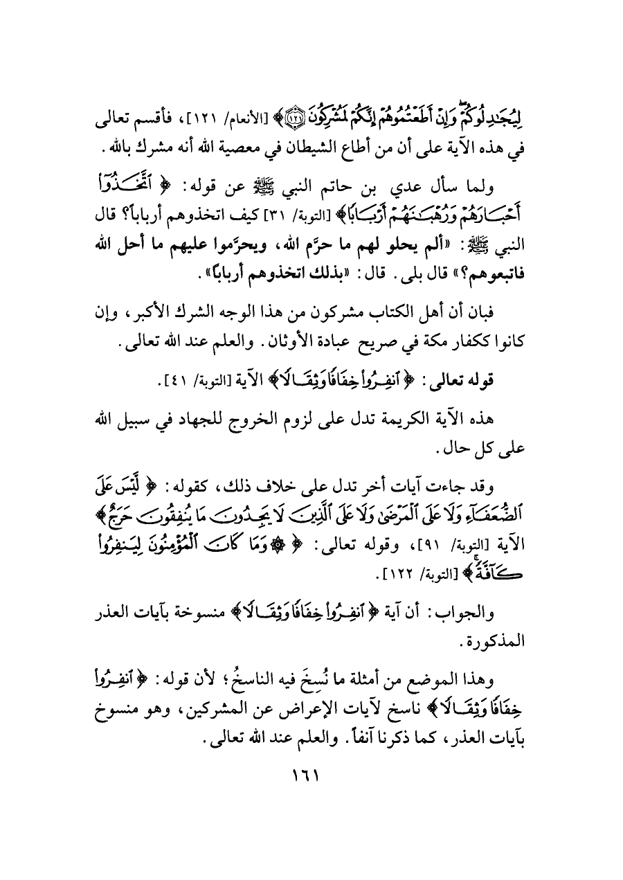 وقد جاءت آيات أخر تدل على خلاف ذلك، كقوله: {لَيْسَ عَلَى الضُّعَفَاءِ وَلَا عَلَى الْمَرْضَى وَلَا عَلَى الَّذِينَ لَا يَجِدُونَ مَا يُنْفِقُونَ حَرَجٌ} الآية [التوبة/ ٩١]، وقوله تعالى: {وَمَا كَانَ الْمُؤْمِنُونَ لِيَنْفِرُوا كَافَّةً} [التوبة/ ١٢٢].
