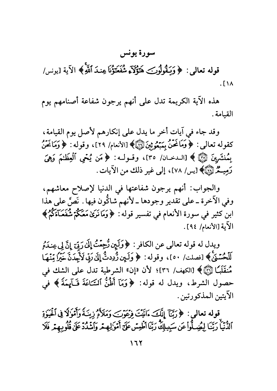 قوله تعالى: {وَيَقُولُونَ هَؤُلَاءِ شُفَعَاؤُنَا عِنْدَ اللَّهِ} الآية [يونس/ ١٨].