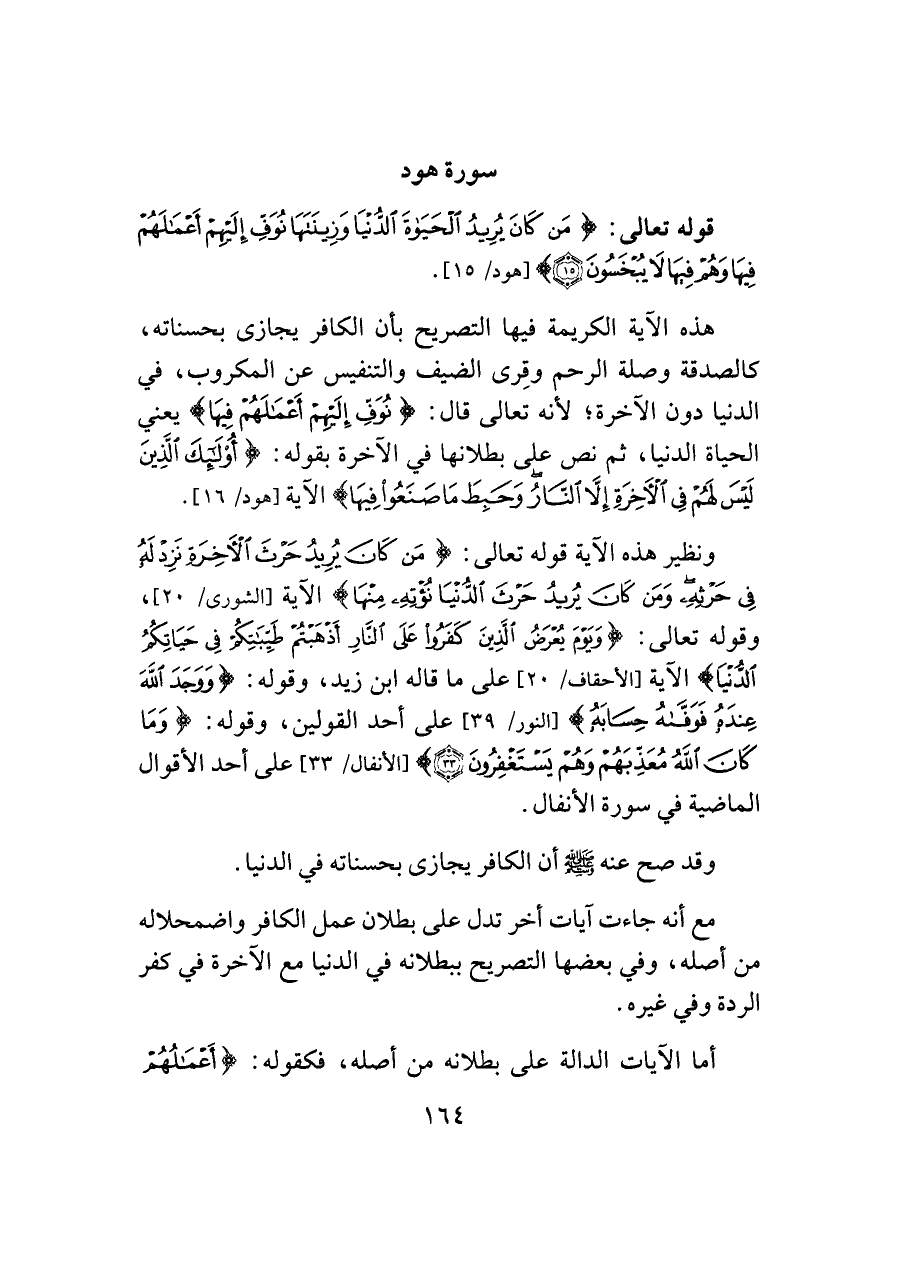 ونظير هذه الآية قوله تعالى: {مَنْ كَانَ يُرِيدُ حَرْثَ الْآخِرَةِ نَزِدْ لَهُ فِي حَرْثِهِ وَمَنْ كَانَ يُرِيدُ حَرْثَ الدُّنْيَا نُؤْتِهِ مِنْهَا} الآية [الشورى/ ٢٠]، وقوله تعالى: {وَيَوْمَ يُعْرَضُ الَّذِينَ كَفَرُوا عَلَى النَّارِ أَذْهَبْتُمْ طَيِّبَاتِكُمْ فِي حَيَاتِكُمُ الدُّنْيَا} الآية [الأحقاف/ ٢٠] على ما قاله ابن زيد، وقوله: {وَوَجَدَ اللَّهَ عِنْدَهُ فَوَفَّاهُ حِسَابَهُ} [النور/ ٣٩] على أحد القولين، وقوله: {وَمَا كَانَ اللَّهُ مُعَذِّبَهُمْ وَهُمْ يَسْتَغْفِرُونَ (٣٣)} [الأنفال/ ٣٣] على أحد الأقوال الماضية في سورة الأنفال.