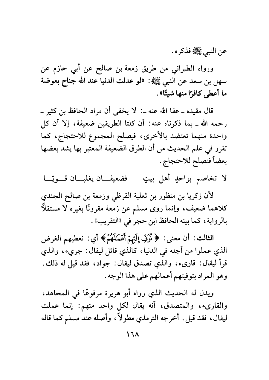 ورواه الطبراني من طريق زمعة بن صالح عن أبي حازم عن سهل بن سعد عن النبي -صلى اللَّه عليه وسلم-: "لو عدلت الدنيا عند اللَّه جناح بعوضة ما أعطى كافرًا منها شيئًا".