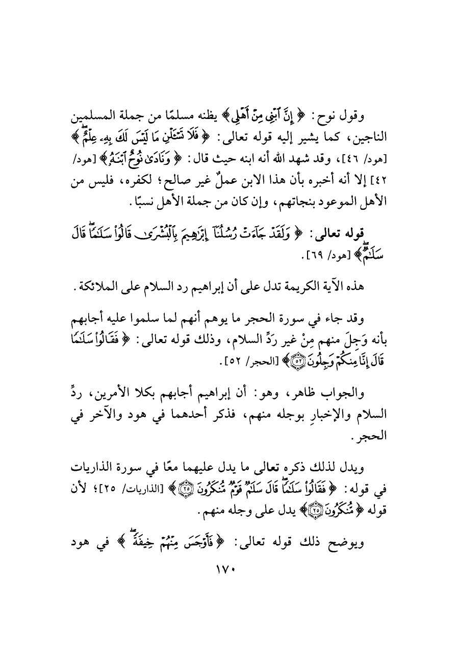 وقول نوح: {إِنَّ ابْنِي مِنْ أَهْلِي} يظنه مسلمًا من جملة المسلمين الناجين، كما يشير إليه قوله تعالى: {فَلَا تَسْأَلْنِ مَا لَيْسَ لَكَ بِهِ عِلْمٌ} [هود/ ٤٦]، وقد شهد اللَّه أنه ابنه حيث قال: {وَنَادَى نُوحٌ ابْنَهُ} [هود/ ٤٢] إلا أنه أخبره بأن هذا الابن عملٌ غير صالح؛ لكفره، فليس من الأهل الموعود بنجاتهم، وإن كان من جملة الأهل نسبًا.