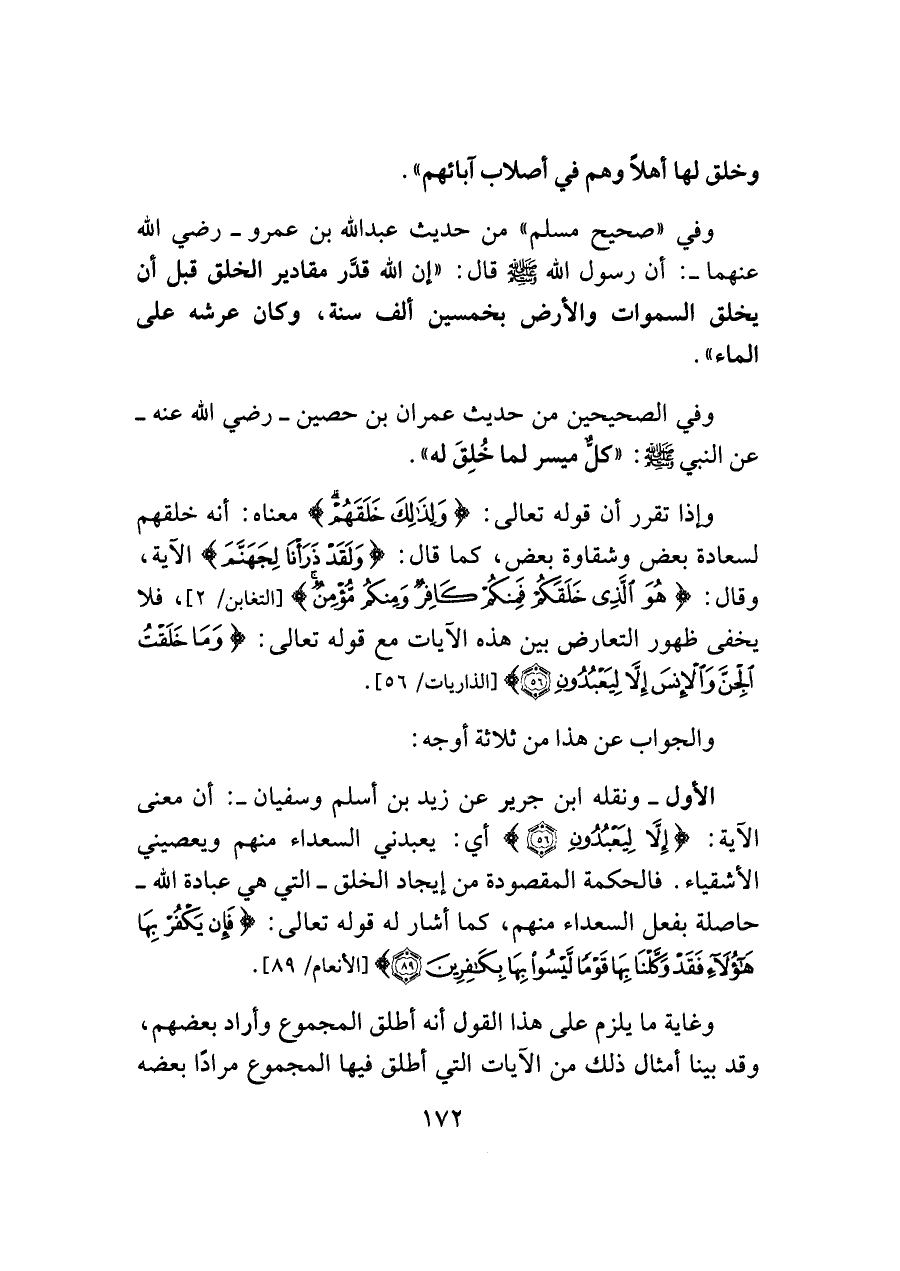 الأول -ونقله ابن جرير عن زيد بن أسلم وسفيان-: أن معنى الآية: {إِلَّا لِيَعْبُدُونِ (٥٦)} أي: يعبدني السعداء منهم ويعصيني الأشقياء. فالحكمة المقصودة من إيجاد الخلق -التي هي عبادة اللَّه- حاصلة بفعل السعداء منهم، كما أشار له قوله تعالى: {فَإِنْ يَكْفُرْ بِهَا هَؤُلَاءِ فَقَدْ وَكَّلْنَا بِهَا قَوْمًا لَيْسُوا بِهَا بِكَافِرِينَ (٨٩)} [الأنعام/ ٨٩].