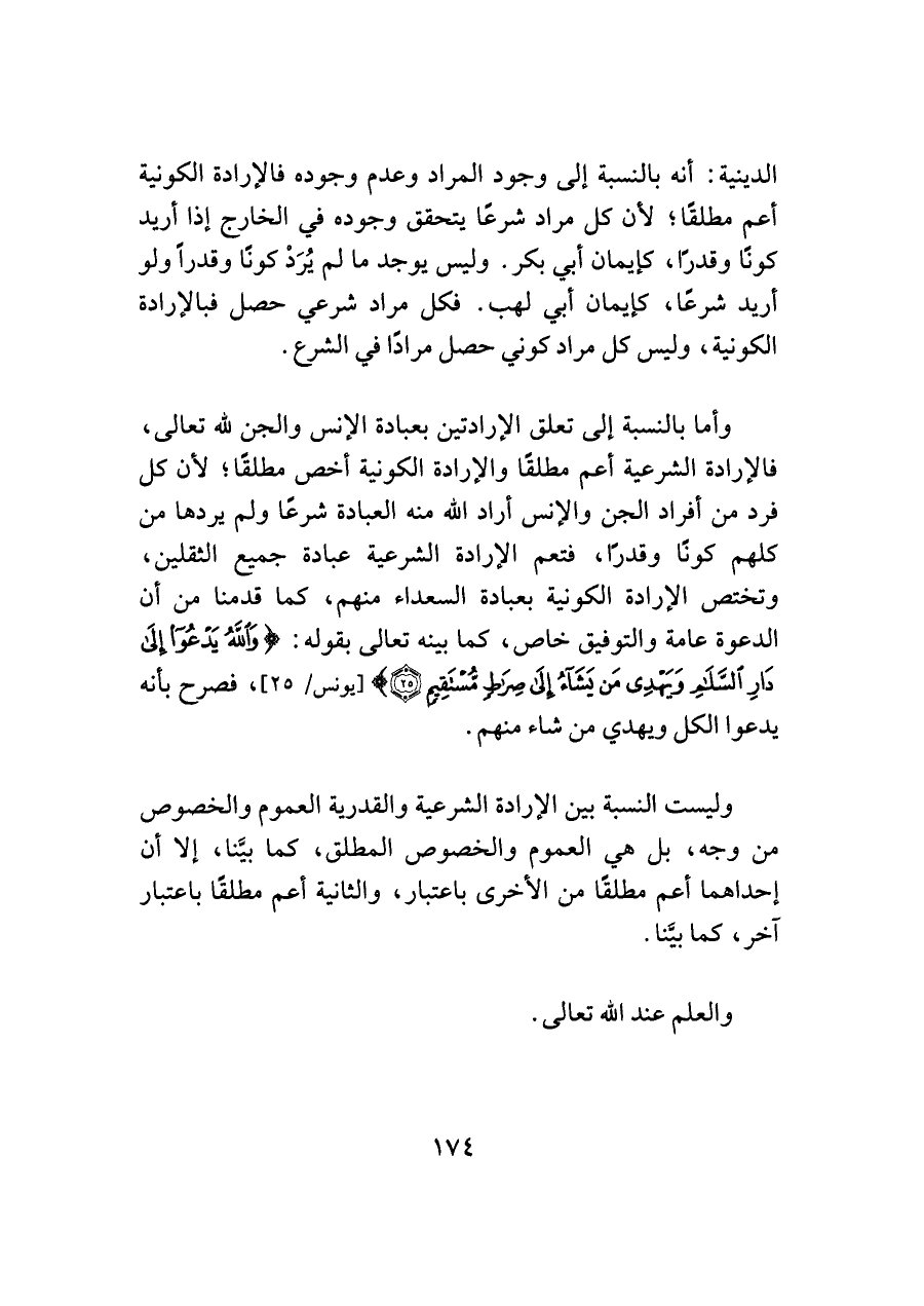 الدينية: أنه بالنسبة إلى وجود المراد وعدم وجوده فالإرادة الكونية أعم مطلقًا؛ لأن كل مراد شرعًا يتحقق وجوده في الخارج إذا أريد كونًا وقدرًا، كإيمان أبي بكر. وليس يوجد ما لم يُرَدْ كونًا وقدرًا ولو أريد شرعًا، كإيمان أبي لهب. فكل مراد شرعي حصل فبالإرادة الكونية، وليس كل مراد كوني حصل مرادًا في الشرع.