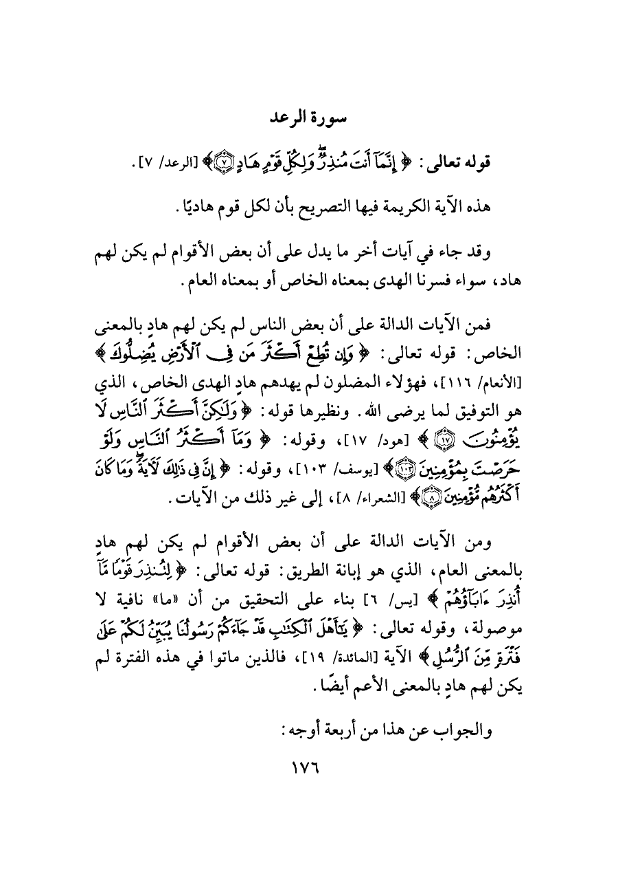 ومن الآيات الدالة على أن بعض الأقوام لم يكن لهم هادٍ بالمعنى العام، الذي هو إبانة الطريق: قوله تعالى: {لِتُنْذِرَ قَوْمًا مَا أُنْذِرَ آبَاؤُهُمْ} [يس/ ٦] بناء على التحقيق من أن "ما" نافية لا موصولة، وقوله تعالى: {يَاأَهْلَ الْكِتَابِ قَدْ جَاءَكُمْ رَسُولُنَا يُبَيِّنُ لَكُمْ عَلَى فَتْرَةٍ مِنَ الرُّسُلِ} الآية [المائدة/ ١٩] فالذين ماتوا في هذه الفترة لم يكن لهم هادٍ بالمعنى الأعم أيضًا.