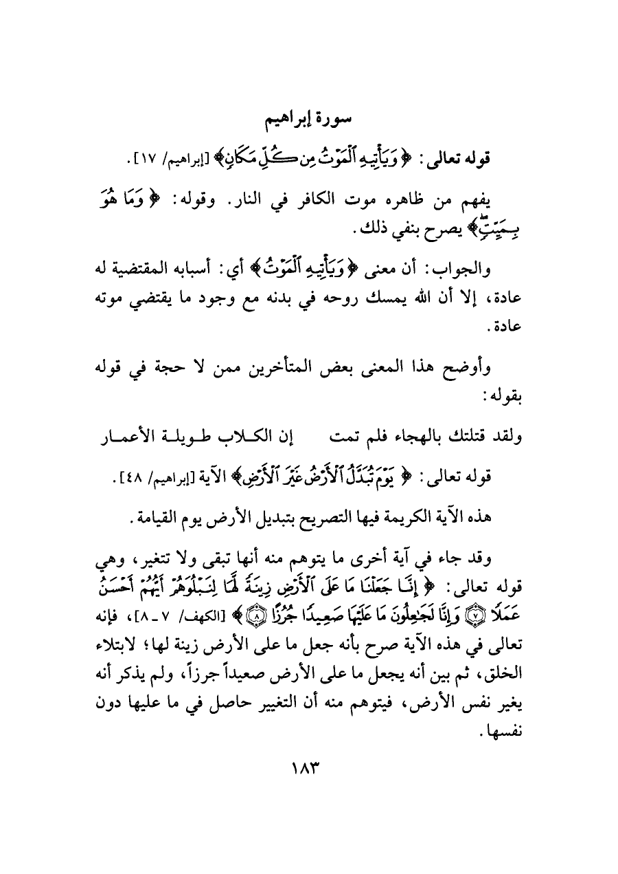 وقد جاء في آية أخرى ما يتوهم منه أنها تبقى ولا تتغير، وهي قوله تعالى: {إِنَّا جَعَلْنَا مَا عَلَى الْأَرْضِ زِينَةً لَهَا لِنَبْلُوَهُمْ أَيُّهُمْ أَحْسَنُ عَمَلًا (٧) وَإِنَّا لَجَاعِلُونَ مَا عَلَيْهَا صَعِيدًا جُرُزًا (٨)} [الكهف/ ٧ - ٨]، فإنه تعالى في هذه الآية صرح بأنه جعل ما على الأرض زينة لها؛ لابتلاء الخلق، ثم بين أنه يجعل ما على الأرض صعيدًا جرزًا، ولم يذكر أنه يغير نفس الأرض، فيتوهم منه أن التغيير حاصل في ما عليها دون نفسها.