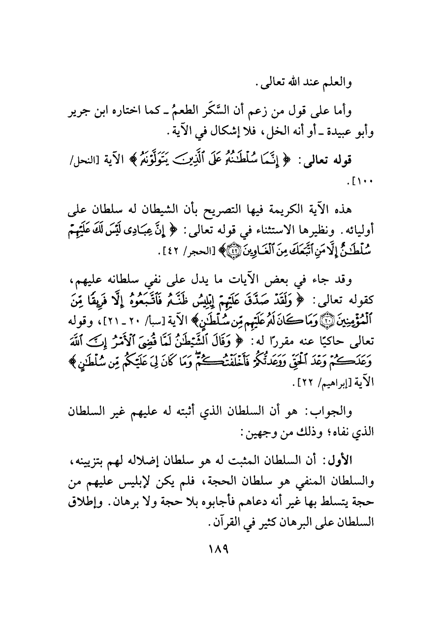 الأول: أن السلطان المثبت له هو سلطان إضلاله لهم بتزيينه، والسلطان المنفي هو سلطان الحجة، فلم يكن لإبليس عليهم من حجة يتسلط بها غير أنه دعاهم فأجابوه بلا حجة ولا برهان. وإطلاق السلطان على البرهان كثير في القرآن.