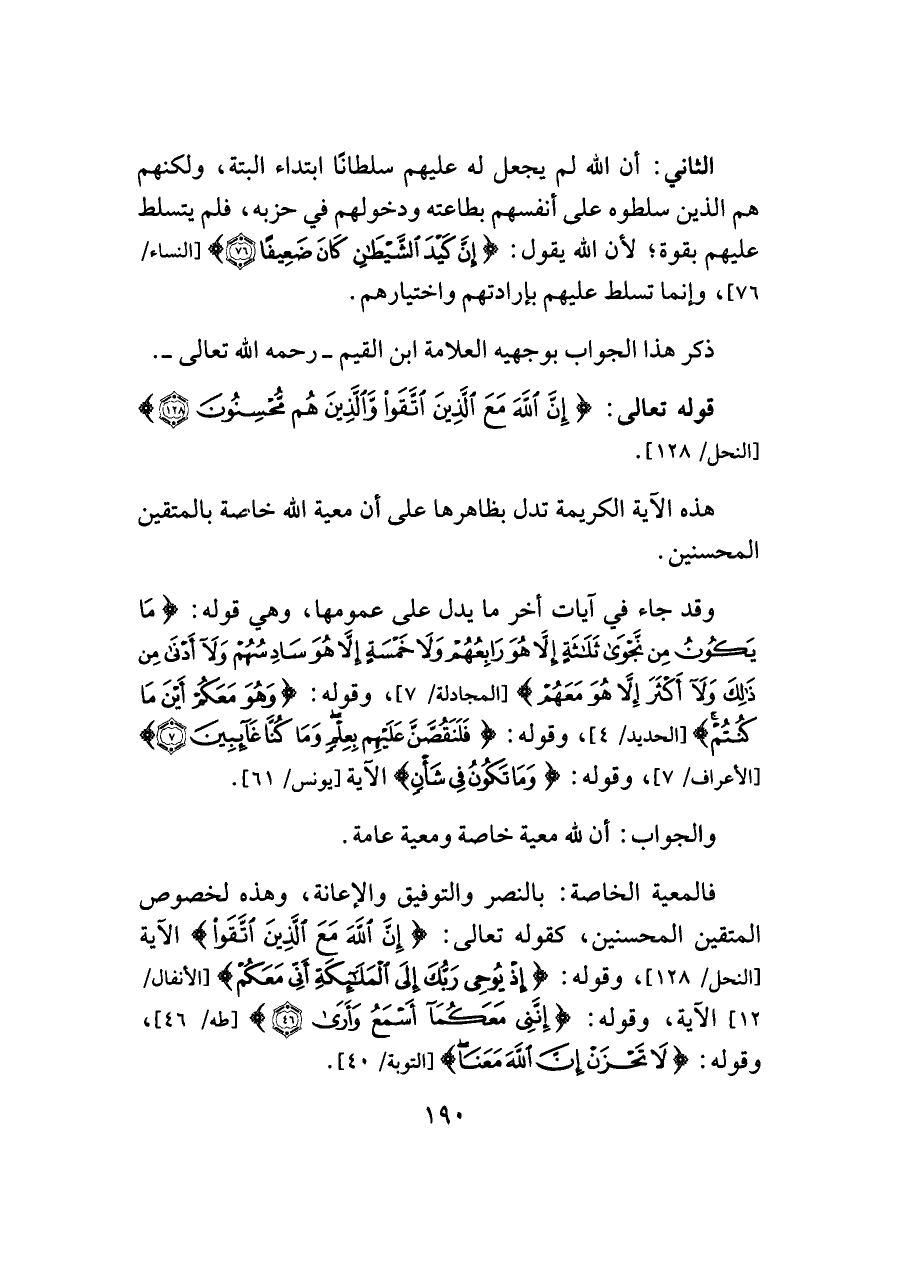 الثاني: أن اللَّه لم يجعل له عليهم سلطانًا ابتداء البتة، ولكنهم هم الذين سلطوه على أنفسهم بطاعته ودخولهم في حزبه، فلم يتسلط عليهم بقوة؛ لأن اللَّه يقول: {إِنَّ كَيْدَ الشَّيْطَانِ كَانَ ضَعِيفًا (٧٦)} [النساء/ ٧٦]، وإنما تسلط عليهم بإرادتهم واختيارهم.