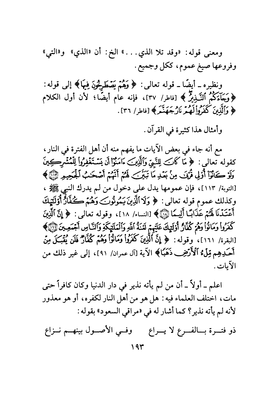 مع أنه جاء في بعض الآيات ما يفهم منه أن أهل الفترة في النار، كقوله تعالى: {مَا كَانَ لِلنَّبِيِّ وَالَّذِينَ آمَنُوا أَنْ يَسْتَغْفِرُوا لِلْمُشْرِكِينَ وَلَوْ كَانُوا أُولِي قُرْبَى مِنْ بَعْدِ مَا تَبَيَّنَ لَهُمْ أَنَّهُمْ أَصْحَابُ الْجَحِيمِ (١١٣)} [التوبة/ ١١٣]، فإن عمومها يدل على دخول من لم يدرك النبي -صلى اللَّه عليه وسلم-، وكذلك عموم قوله تعالى: {وَلَا الَّذِينَ يَمُوتُونَ وَهُمْ كُفَّارٌ أُولَئِكَ أَعْتَدْنَا لَهُمْ عَذَابًا أَلِيمًا (١٨)} [النساء/ ١٨]، وقوله تعالى: {إِنَّ الَّذِينَ كَفَرُوا وَمَاتُوا وَهُمْ كُفَّارٌ أُولَئِكَ عَلَيْهِمْ لَعْنَةُ اللَّهِ وَالْمَلَائِكَةِ وَالنَّاسِ أَجْمَعِينَ (١٦١)} [البقرة/ ١٦١]، وقوله: {إِنَّ الَّذِينَ كَفَرُوا وَمَاتُوا وَهُمْ كُفَّارٌ فَلَنْ يُقْبَلَ مِنْ أَحَدِهِمْ مِلْءُ الْأَرْضِ ذَهَبًا} الآية [آل عمران/ ٩١]، إلى غير ذلك من الآيات.