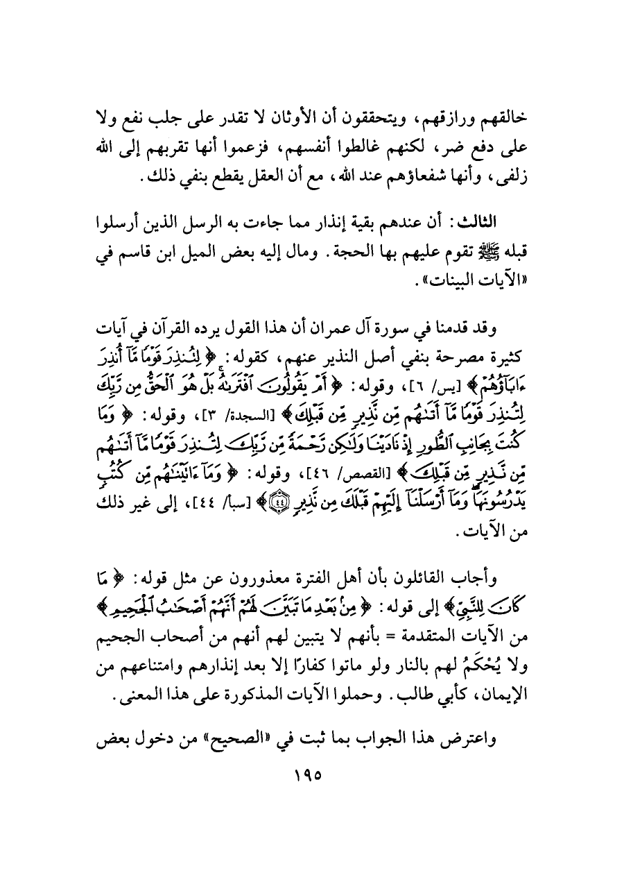 وقد قدمنا في سورة آل عمران أن هذا القول يرده القرآن في آيات كثيرة مصرحة بنفي أصل النذير عنهم، كقوله: {لِتُنْذِرَ قَوْمًا مَا أُنْذِرَ آبَاؤُهُمْ} [يس/ ٦]، وقوله: {أَمْ يَقُولُونَ افْتَرَاهُ بَلْ هُوَ الْحَقُّ مِنْ رَبِّكَ لِتُنْذِرَ قَوْمًا مَا أَتَاهُمْ مِنْ نَذِيرٍ مِنْ قَبْلِكَ} [السجدة/ ٣]، وقوله: {وَمَا كُنْتَ بِجَانِبِ الطُّورِ إِذْ نَادَيْنَا وَلَكِنْ رَحْمَةً مِنْ رَبِّكَ لِتُنْذِرَ قَوْمًا مَا أَتَاهُمْ مِنْ نَذِيرٍ مِنْ قَبْلِكَ} [القصص/ ٤٦]، وقوله: {وَمَا آتَيْنَاهُمْ مِنْ كُتُبٍ يَدْرُسُونَهَا وَمَا أَرْسَلْنَا إِلَيْهِمْ قَبْلَكَ مِنْ نَذِيرٍ (٤٤)} [سبأ/ ٤٤]، إلى غير ذلك من الآيات.