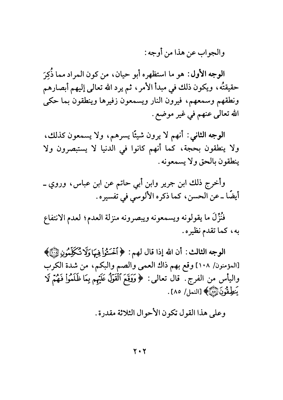 الوجه الثالث: أن اللَّه إذا قال لهم: {قَالَ اخْسَئُوا فِيهَا وَلَا تُكَلِّمُونِ (١٠٨)} [المؤمنون/ ١٠٨] وقع بهم ذاك العمى والصم والبكم، من شدة الكرب واليأس من الفرج. قال تعالى: {وَوَقَعَ الْقَوْلُ عَلَيْهِمْ بِمَا ظَلَمُوا فَهُمْ لَا يَنْطِقُونَ (٨٥)} [النمل/ ٨٥].
