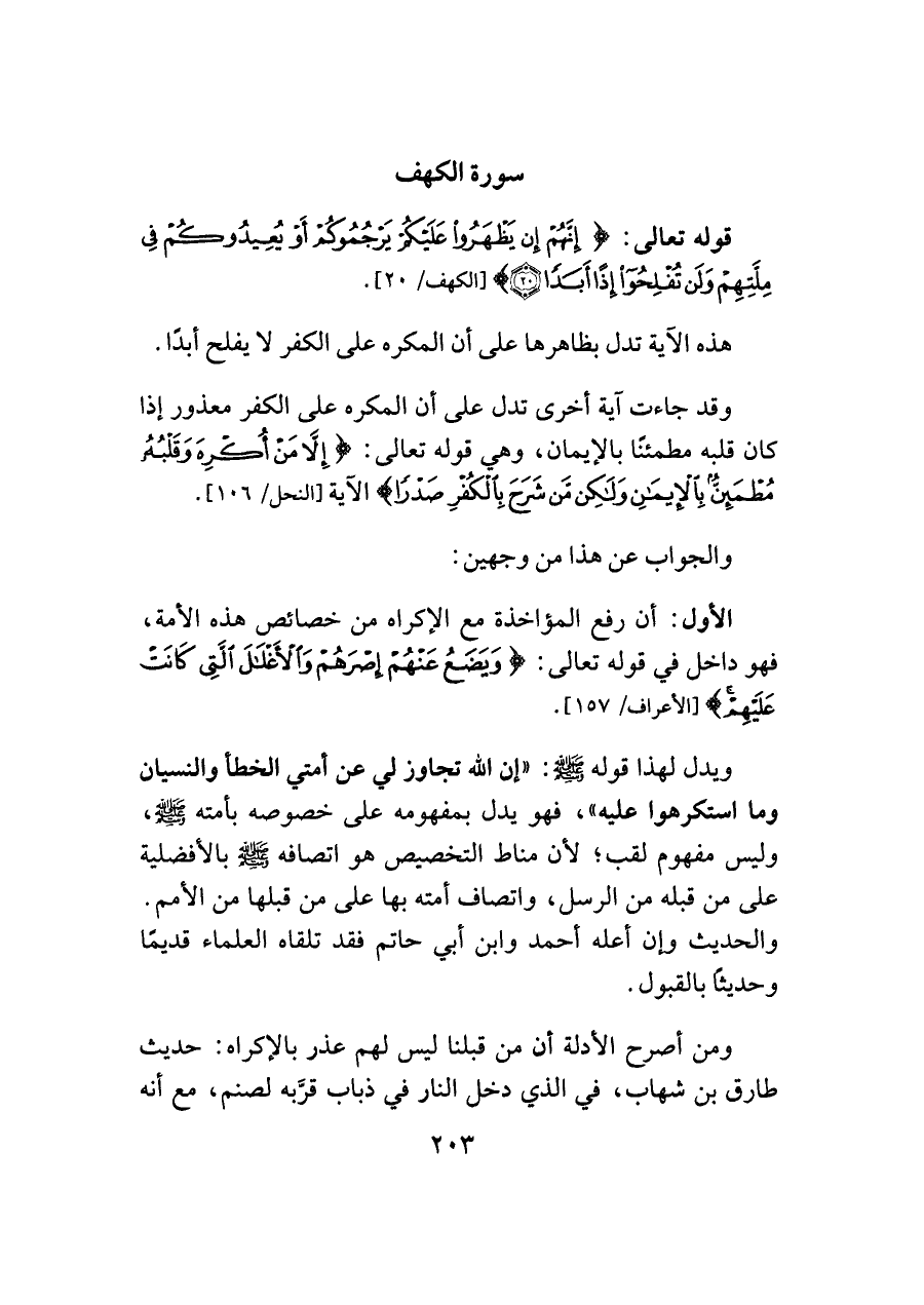 الأول: أن رفع المؤاخذة مع الإكراه من خصائص هذه الأمة، فهو داخل في قوله تعالى: {وَيَضَعُ عَنْهُمْ إِصْرَهُمْ وَالْأَغْلَالَ الَّتِي كَانَتْ عَلَيْهِمْ} [الأعراف/ ١٥٧].