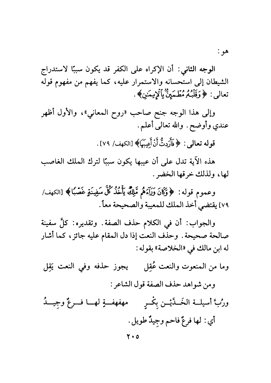 الوجه الثاني: أن الإكراه على الكفر قد يكون سببًا لاستدراج الشيطان إلى استحسانه والاستمرار عليه، كما يفهم من مفهوم قوله تعالى: {وَقَلْبُهُ مُطْمَئِنٌّ بِالْإِيمَانِ}.