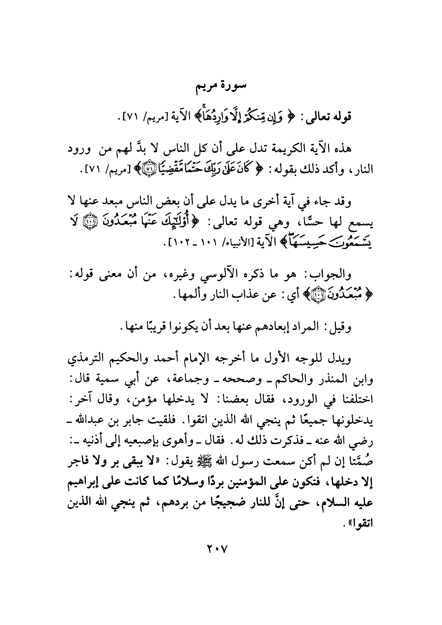 ويدل للوجه الأول ما أخرجه الإمام أحمد والحكيم الترمذي وابن المنذر والحاكم -وصححه- وجماعة، عن أبي سمية قال: اختلفنا في الورود، فقال بعضنا: لا يدخلها مؤمن، وقال آخر: يدخلونها جميعًا ثم ينجي اللَّه الذين اتقوا. فلقيت جابر بن عبد اللَّه -رضي اللَّه عنه- فذكرت ذلك له. فقال -وأهوى بإصبعيه إلى أذنيه-: صُمَّتا إن لم أكن سمعت رسول اللَّه -صلى اللَّه عليه وسلم- يقول: "لا يبقى بر ولا فاجر إلا دخلها، فتكون على المؤمنين بردًا وسلامًا كما كانت على إبراهيم عليه السلام، حتى إنَّ للنار ضجيجًا من بردهم، ثم ينجي اللَّه الذين اتقوا".