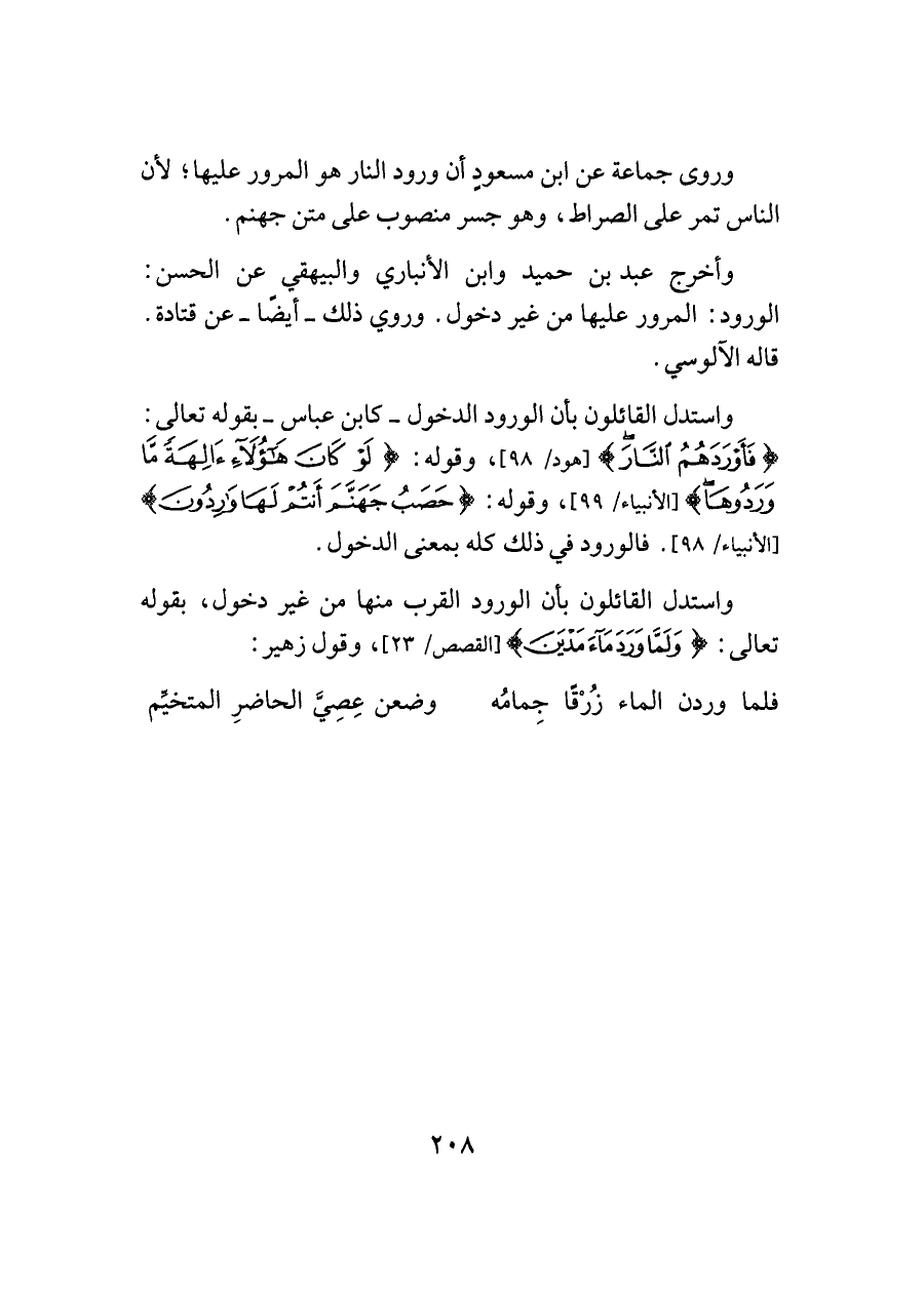 واستدل القائلون بأن الورود القرب منها من غير دخول، بقوله تعالى: {وَلَمَّا وَرَدَ مَاءَ مَدْيَنَ} [القصص/ ٢٣]، وقول زهير:
