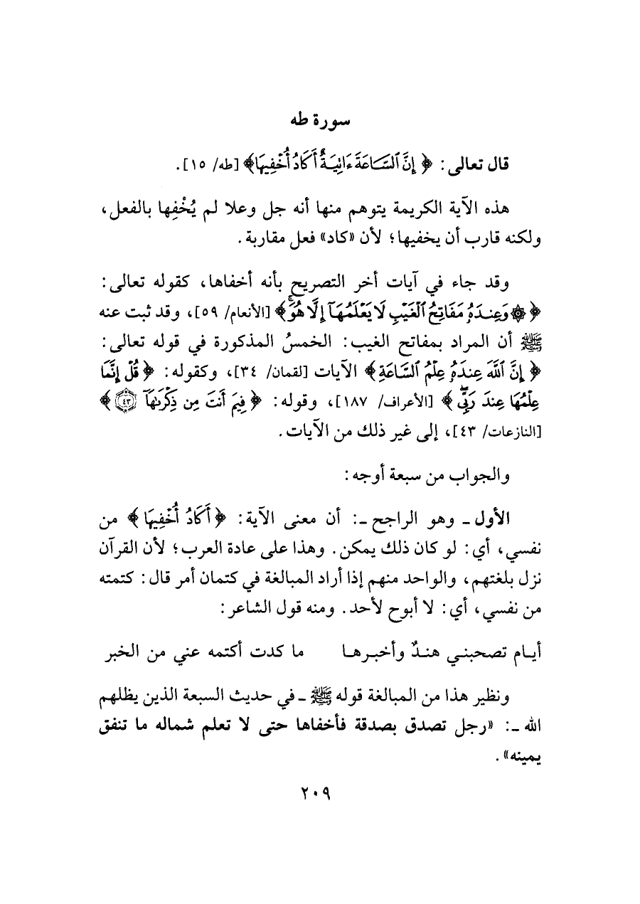 وقد جاء في آيات أخر التصريح بأنه أخفاها، كقوله تعالى: {وَعِنْدَهُ مَفَاتِحُ الْغَيْبِ لَا يَعْلَمُهَا إِلَّا هُوَ} [الأنعام/ ٥٩]، وقد ثبت عنه -صلى اللَّه عليه وسلم- أن المراد بمفاتح الغيب: الخمسُ المذكورة في قوله ثعالى: {إِنَّ اللَّهَ عِنْدَهُ عِلْمُ السَّاعَةِ} الآيات [لقمان/ ٣٤]، وكقوله: {قُلْ إِنَّمَا عِلْمُهَا عِنْدَ رَبِّي} [الأعراف/ ١٨٧]، وقوله: {فِيمَ أَنْتَ مِنْ ذِكْرَاهَا (٤٣)} [النازعات/ ٤٣]، إلى غير ذلك من الآيات.
