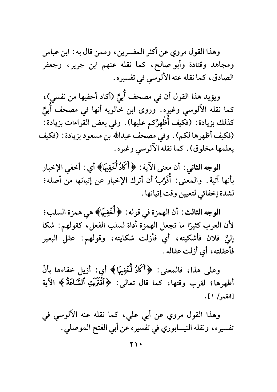ويؤيد هذا القول أن في مصحف أُبيٍّ (أكاد أخفيها من نفسي)، كما نقله الآلوسي وغيره. وروى ابن خالويه أنها في مصحف أُبيٍّ كذلك بزيادة: (فكيف أُظْهِرُكم عليها). وفي بعض القراءات بزيادة: (فكيف أظهرها لكم). وفي مصحف عبد اللَّه بن مسعود بزيادة: (فكيف يعلمها مخلوق). كما نقله الآلوسي وغيره.
