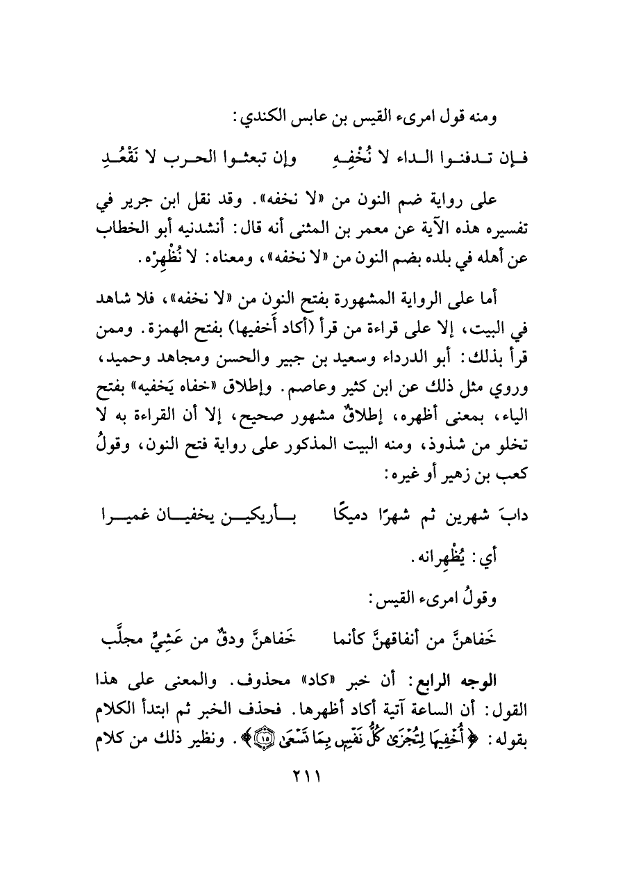 الوجه الرابع: أن خبر "كاد" محذوف. والمعنى على هذا القول: أن الساعة آتية أكاد أظهرها. فحذف الخبر ثم ابتدأ الكلام بقوله: {أُخْفِيهَا لِتُجْزَى كُلُّ نَفْسٍ بِمَا تَسْعَى (١٥)}. ونظير ذلك من كلام