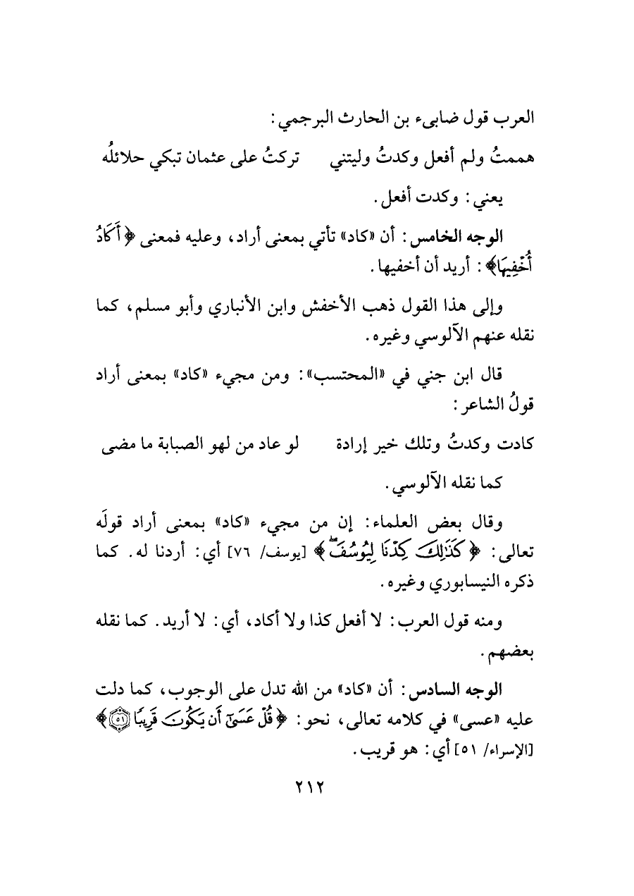 الوجه الخامس: أن "كاد" تأتي بمعنى أراد، وعليه فمعنى {أَكَادُ أُخْفِيهَا}: أريد أن أخفيها.