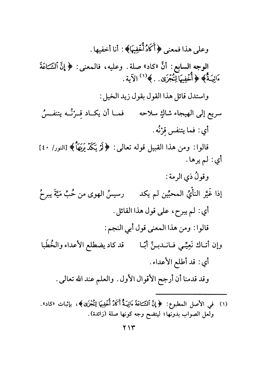 (¬١) في الأصل المطبوع: {إِنَّ السَّاعَةَ آتِيَةٌ أَكَادُ أُخْفِيهَا لِتُجْزَى}، بإثبات "كاد". ولعل الصواب بدونها؛ ليتضح وجه كونها صلة (زائدة).