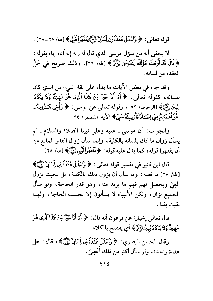 قال ابن كثير في تفسير قوله تعالى: {وَاحْلُلْ عُقْدَةً مِنْ لِسَانِي (٢٧)} [طه/ ٢٧] ما نصه: وما سأل أن يزول ذلك بالكلية، بل بحيث يزول العِيُّ ويحصل لهم فهم ما يريد منه، وهو قدر الحاجة، ولو سأل الجميع لزال، ولكن الأنبياء لا يسألون إلا بحسب الحاجة، ولهذا بقيت بقية.