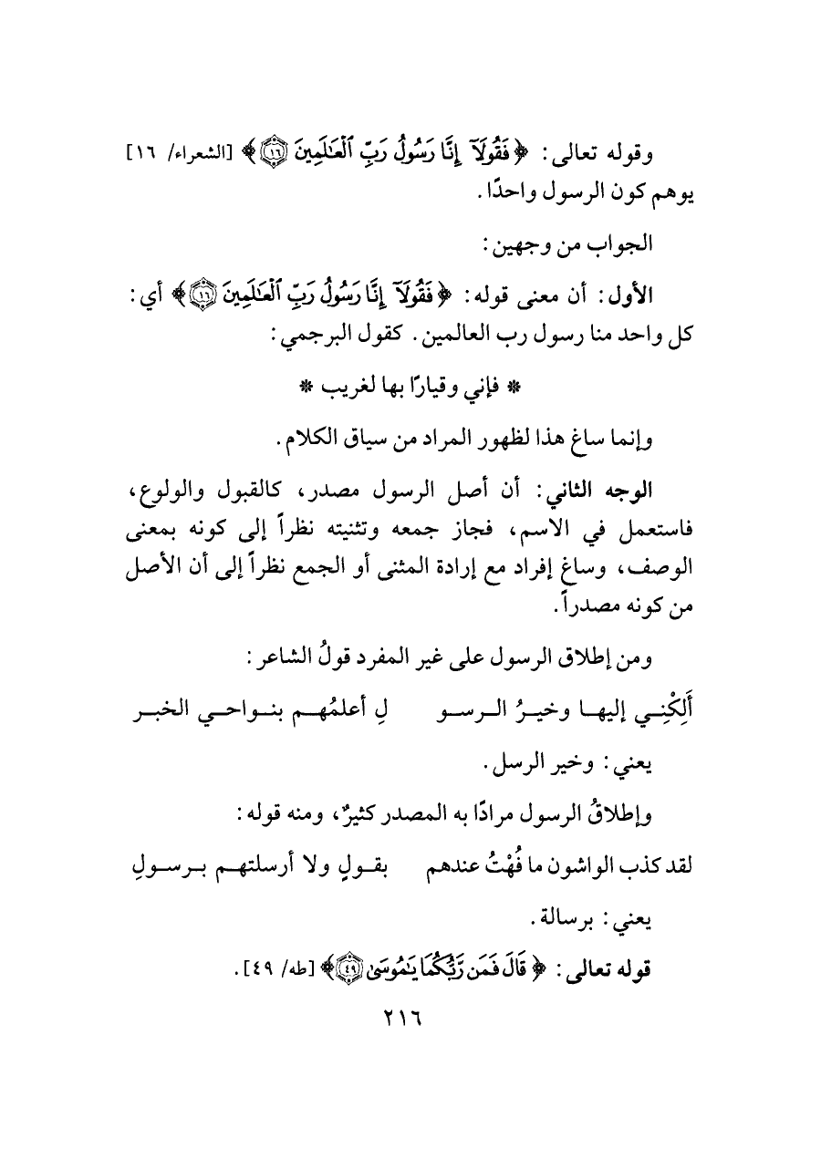 الوجه الثاني: أن أصل الرسول مصدر، كالقبول والولوع، فاستعمل في الاسم، فجاز جمعه وتثنيته نظرًا إلى كونه بمعنى الوصف، وساغ إفراد مع إرادة المثنى أو الجمع نظرًا إلى أن الأصل من كونه مصدرًا.
