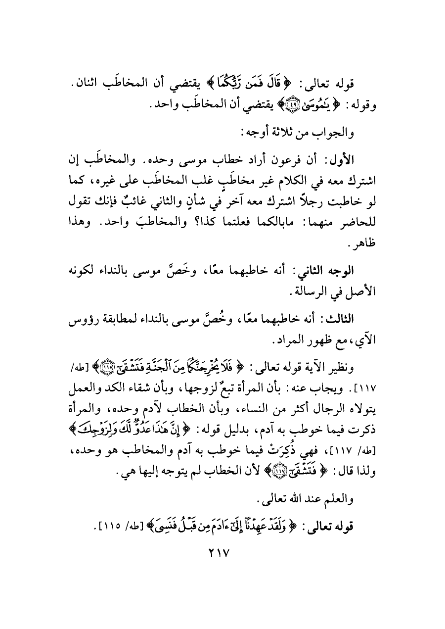 الثالث: أنه خاطبهما معًا، وخُصَّ موسى بالنداء لمطابقة رؤوس الآي، مع ظهور المراد.