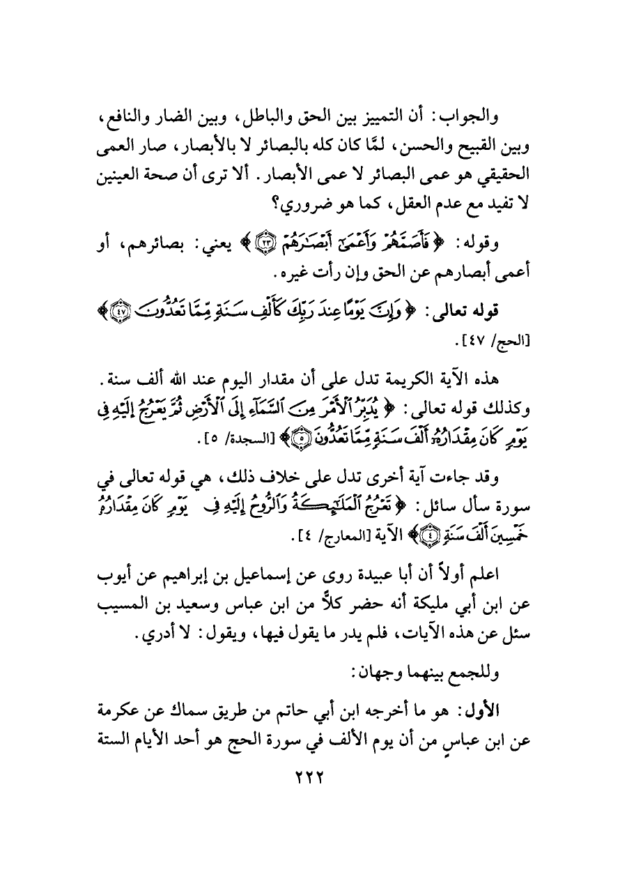 الأول: هو ما أخرجه ابن أبي حاتم من طريق سماك عن عكرمة عن ابن عباسٍ من أن يوم الألف في سورة الحج هو أحد الأيام الستة