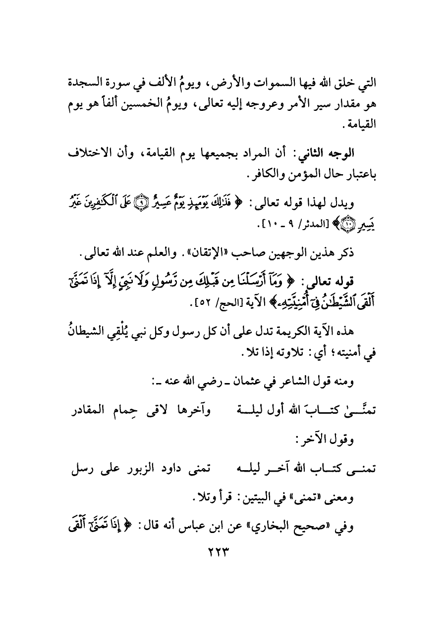 التي خلق اللَّه فيها السموات والأرض، ويومُ الألف في سورة السجدة هو مقدار سير الأمر وعروجه إليه تعالى، ويومُ الخمسين ألفًا هو يوم القيامة.
